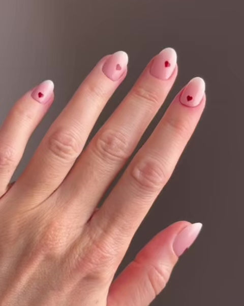 Innamorati dei nostri Secret Crush Press Ons! Queste adorabili unghie corte e tonde in babyboomer rosa delicato sono arricchite da dolci cuoricini rosso scuro. Perfette per rendere speciale la tua quotidianità o conquistare il tuo crush con un tocco giocoso – un look che conquista i cuori.